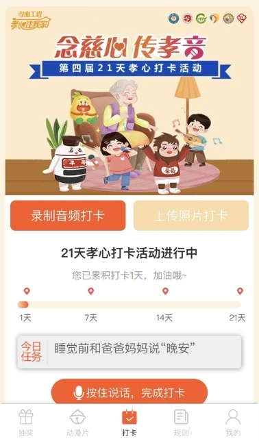 “21天孝心打卡”活动面向广大儿童及家庭,引导其每日线上打卡一件孝心小事,如早晚和爸爸妈妈问好、给爷爷奶奶打电话问候,在持续实践中培养孝老习惯。截至目前,打卡次数已破1万。